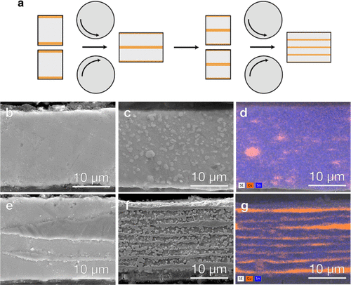 Figure 1. (a) Schematic depicting the ARB process, (b) SEM micrograph depicting an elemental tin foil, (c) SEM micrograph depicting a pewter foil, (d) EDX map overlayed upon a secondary electron image displaying the distribution of copper and tin within the pewter foil, (e) SEM micrograph depicting a nonuniform Sn/Cu multilayered composite foil, (f) SEM micrograph depicting a pewter/copper NCF, and (g) EDX map overlayed upon a secondary electron image displaying the distribution of copper and tin within the pewter/copper NCF. Tin is shown as blue, and copper is shown as orange in the elemental EDX maps.